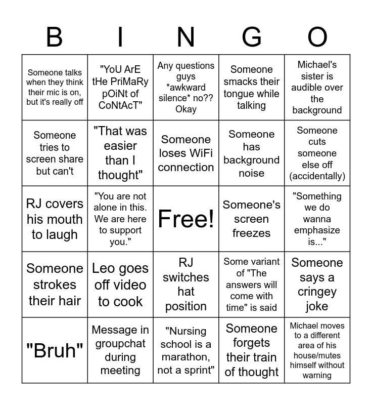 This bingo card has a free space and 24 words: Leo goes off video to cook, Message in groupchat during meeting, Someone loses WiFi connection, "Bruh", Michael's sister is audible over the background, Someone talks when they think their mic is on, but it's really off, Someone tries to screen share but can't, "YoU ArE tHe PriMaRy pOiNt of CoNtAcT", Someone's screen freezes, RJ switches hat position, Someone has background noise, RJ covers his mouth to laugh, Some variant of "The answers will come with time" is said, Someone says a cringey joke, "That was easier than I thought", Someone forgets their train of thought, "Something we do wanna emphasize is...", Any questions guys *awkward silence* no?? Okay, Someone cuts someone else off (accidentally), "You are not alone in this. We are here to support you.", Michael moves to a different area of his house/mutes himself without warning, Someone strokes their hair, Someone smacks their tongue while talking and "Nursing school is a marathon, not a sprint".