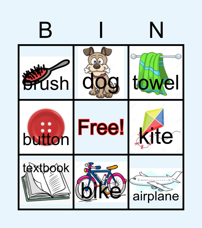 This bingo card has 12 images, a free space and 12 words: sock, farm, airplane, kite, dog, towel, bike, robot, brush, button, textbook and shoe.