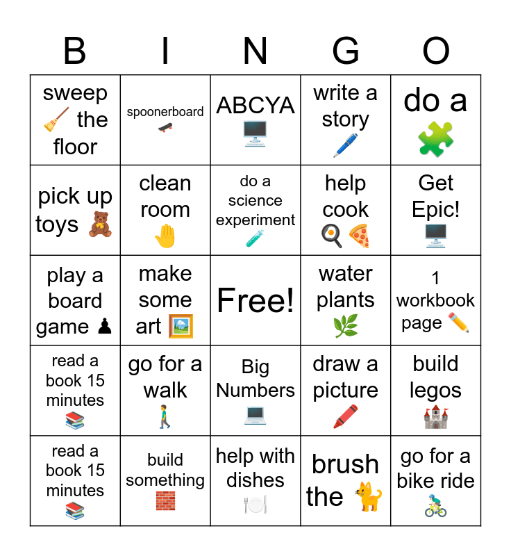 This bingo card has a free space and 29 words: read a book 15 minutes π, play outside π³π, make some art πΌ, help with laundry π½, sweep π§Ή the floor, ABCYA π₯, clean room π€, go for a walk πΆββοΈ, water plants πΏ, build something π§±, 1 workbook page βοΈ, go for a bike ride π΄π»ββοΈ, help with dishes π½, brush the π, Get Epic! π₯, play some music π΅, Big Numbers π», read a book 15 minutes π, do a π§©, play a board game β, draw a pictureπ, vacuum carpet, help cook π³π, pick up toys π§Έ, write a story π, spoonerboard πΉ, build legos π°, do a science experiment π§ͺ and watch zoo/aquarium cam ππ π¦.