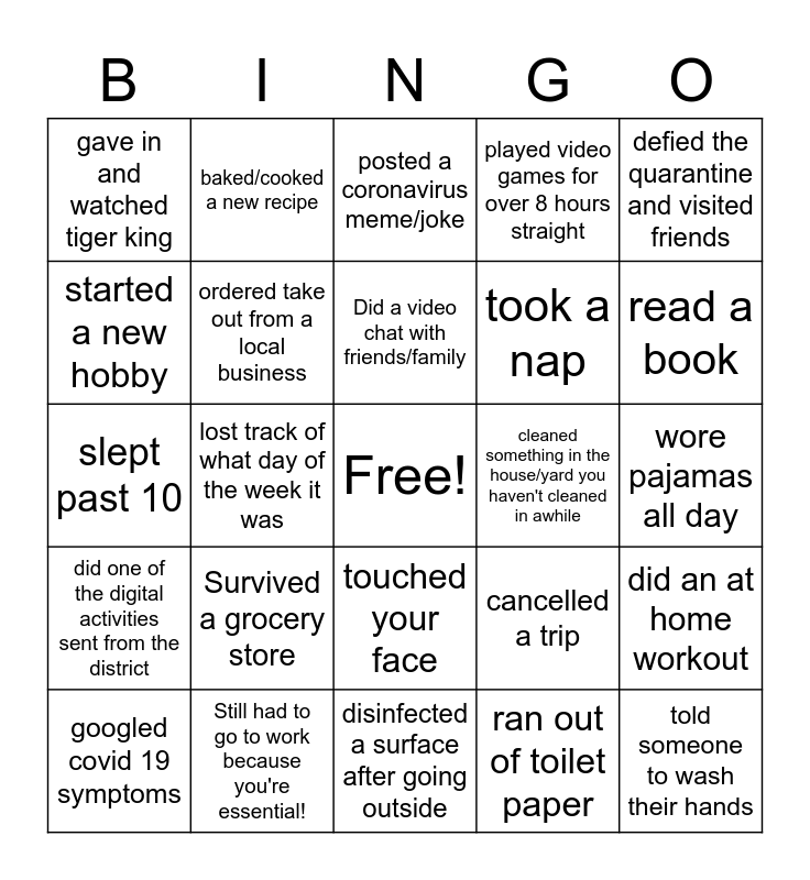 Coronavirus Bingo | Bored in a house bingo | Survivedk because you're essential! Did a video chat with friends/family googled covid 19 symptoms defied the quarantine and visited friends gave in and watched tiger king started a new hobby baked/cooked a new rec | ~*Back from Spring Break BINGO!*~ | Spring Break - Peer Bingo
