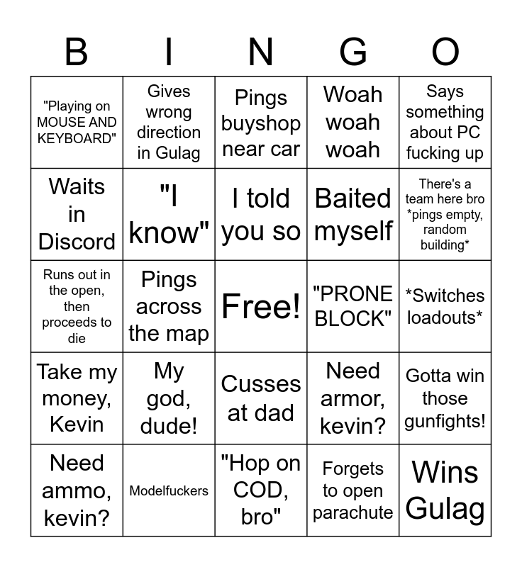This bingo card has a free space and 24 words: My god, dude!, Modelfuckers, I told you so, Need ammo, kevin?, Says something about PC fucking up, "Playing on MOUSE AND KEYBOARD", Waits in Discord, Gives wrong direction in Gulag, "PRONE BLOCK", Cusses at dad, Baited myself, Runs out in the open, then proceeds to die, Need armor, kevin?, Gotta win those gunfights!, "I know", Forgets to open parachute, *Switches loadouts*, Pings buyshop near car, There's a team here bro *pings empty, random building*, Pings across the map, Wins Gulag, Take my money, Kevin, Woah woah woah and "Hop on COD, bro".