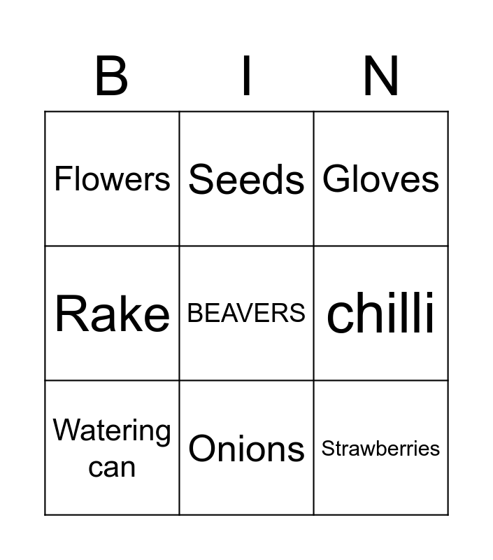 This bingo card has a free space and 11 words: Spade, Onions, Strawberries, Watering can, Seeds, Gloves, chilli, Tomatoes, Rake, Flowers and Herbs.