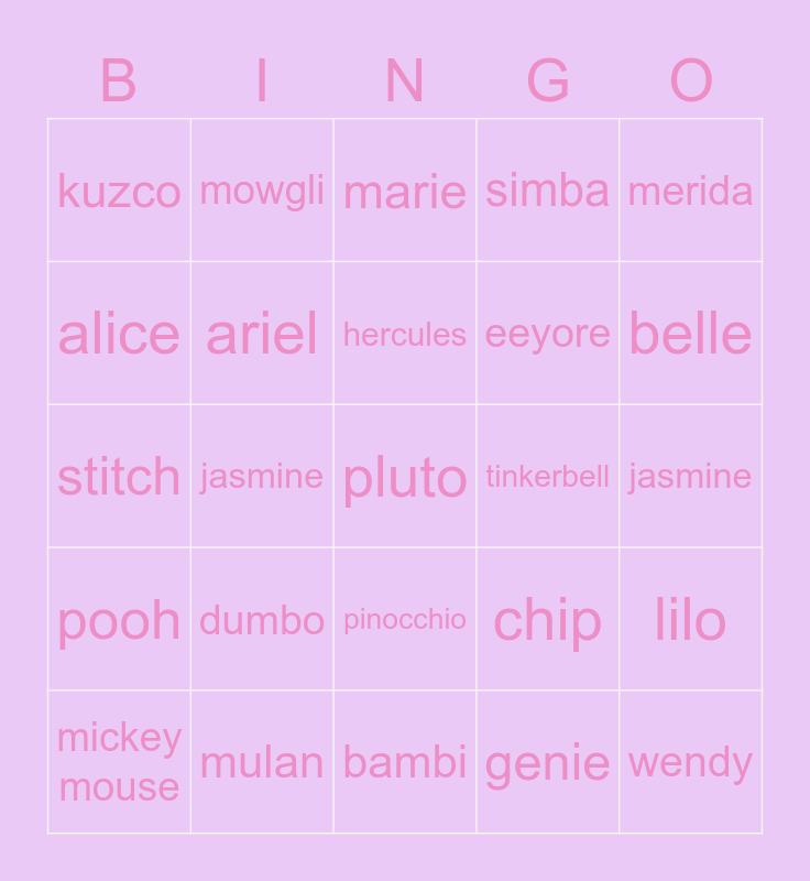 This bingo card has 25 words: pooh, mulan, pluto, genie, merida, kuzco, mowgli, marie, tinkerbell, lilo, alice, ariel, bambi, chip, belle, mickey mouse, jasmine, hercules, eeyore, jasmine, stitch, dumbo, pinocchio, simba and wendy.
