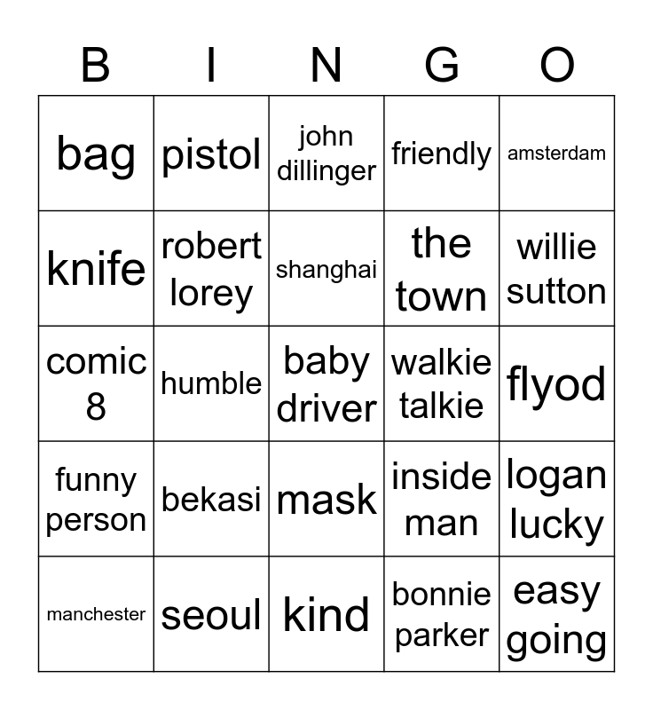 This bingo card has a free space and 24 words: bekasi, seoul, shanghai, manchester, amsterdam, bag, knife, pistol, walkie talkie, mask, the town, comic 8, inside man, logan lucky, robert lorey, bonnie parker, flyod, john dillinger, willie sutton, humble, easy going, funny person, friendly and kind.