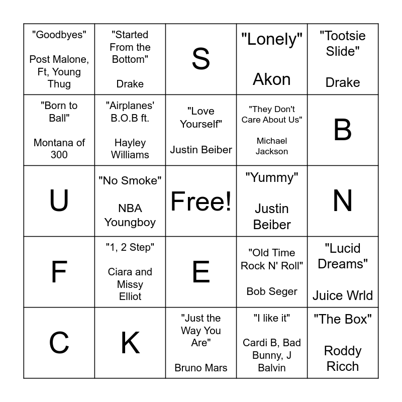 This bingo card has a free space and 48 words: "Respect" Aretha Franklin, "The Box" Roddy Ricch, "Perfect" Ed Sheeran, "Just the Way You Are" Bruno Mars, "1, 2 Step" Ciara and Missy Elliot, "Don't Stop Believin'' Journey, "Started From the Bottom" Drake, "Close Friends" Lil Baby, "Born to Ball" Montana of 300, "Lonely" Speaker Knockerz, "Airplanes' B.O.B ft. Hayley Williams, "Lonely" Akon, "Lucid Dreams" Juice Wrld, "Old Time Rock N' Roll" Bob Seger, "Always Be M Baby" Mariah Carey, "Happier" Marshmello ft. Bastille, "Love Yourself" Justin Beiber, "Yummy" Justin Beiber, "Thank u, Next" Ariana Grande, "Tootsie Slide" Drake, "No Smoke" NBA Youngboy, "I like it" Cardi B, Bad Bunny, J Balvin, "Goodbyes" Post Malone, Ft, Young Thug, "They Don't Care About Us" Michael Jackson, A, B, C, D, E, F, G, H, I, J, K, L, M, N, O, P, Q, R, S, T, U, V, W and X.