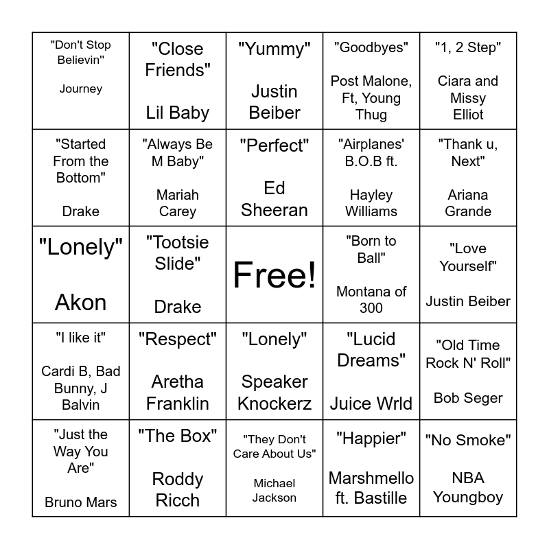 This bingo card has a free space and 24 words: "Respect" Aretha Franklin, "The Box" Roddy Ricch, "Perfect" Ed Sheeran, "Just the Way You Are" Bruno Mars, "1, 2 Step" Ciara and Missy Elliot, "Don't Stop Believin'' Journey, "Started From the Bottom" Drake, "Close Friends" Lil Baby, "Born to Ball" Montana of 300, "Lonely" Speaker Knockerz, "Airplanes' B.O.B ft. Hayley Williams, "Lonely" Akon, "Lucid Dreams" Juice Wrld, "Old Time Rock N' Roll" Bob Seger, "Always Be M Baby" Mariah Carey, "Happier" Marshmello ft. Bastille, "Love Yourself" Justin Beiber, "Yummy" Justin Beiber, "Thank u, Next" Ariana Grande, "Tootsie Slide" Drake, "No Smoke" NBA Youngboy, "I like it" Cardi B, Bad Bunny, J Balvin, "Goodbyes" Post Malone, Ft, Young Thug and "They Don't Care About Us" Michael Jackson.