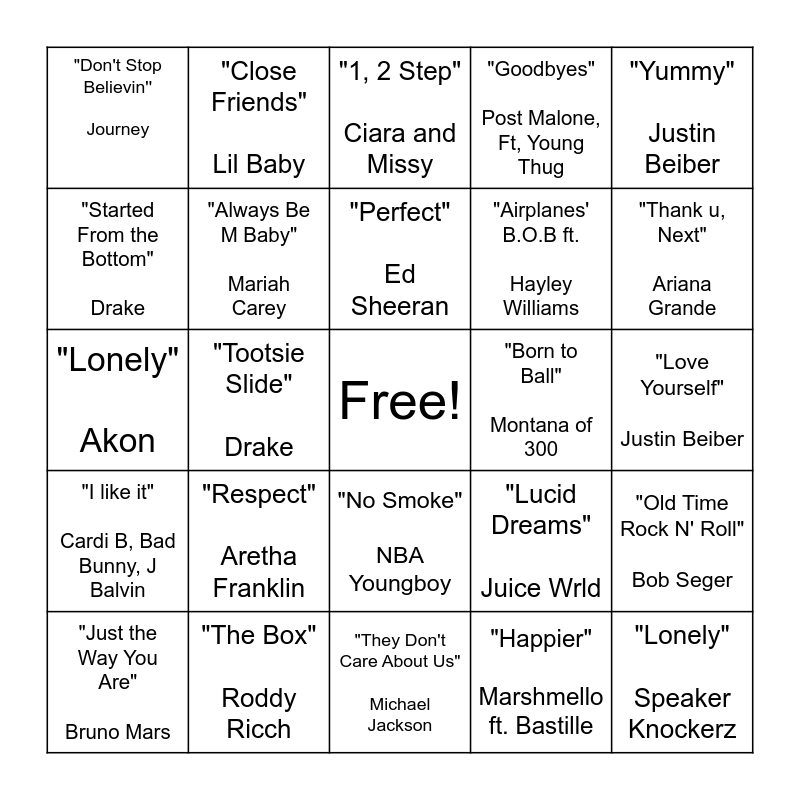 This bingo card has a free space and 24 words: "Respect" Aretha Franklin, "The Box" Roddy Ricch, "Perfect" Ed Sheeran, "Just the Way You Are" Bruno Mars, "Yummy" Justin Beiber, "Don't Stop Believin'' Journey, "Started From the Bottom" Drake, "Close Friends" Lil Baby, "Born to Ball" Montana of 300, "No Smoke" NBA Youngboy, "Airplanes' B.O.B ft. Hayley Williams, "Lonely" Akon, "Lucid Dreams" Juice Wrld, "Old Time Rock N' Roll" Bob Seger, "Always Be M Baby" Mariah Carey, "Happier" Marshmello ft. Bastille, "Love Yourself" Justin Beiber, "1, 2 Step" Ciara and Missy, "Thank u, Next" Ariana Grande, "Tootsie Slide" Drake, "Lonely" Speaker Knockerz, "I like it" Cardi B, Bad Bunny, J Balvin, "Goodbyes" Post Malone, Ft, Young Thug and "They Don't Care About Us" Michael Jackson.