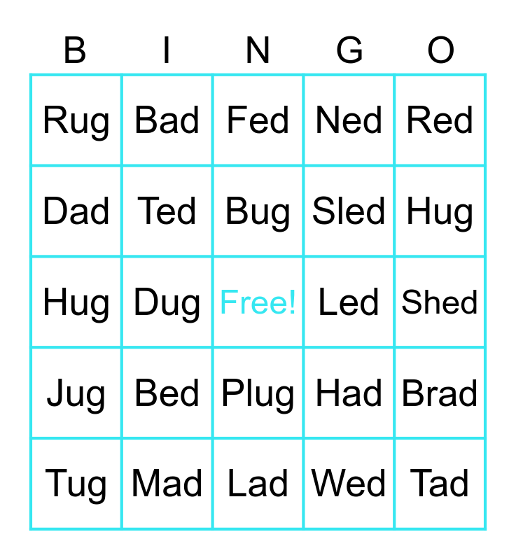 This bingo card has a free space and 24 words: Bed, Mad, Bug, Tug, Red, Rug, Dad, Bad, Led, Plug, Sled, Hug, Had, Brad, Ted, Wed, Shed, Fed, Hug, Dug, Tad, Jug, Ned and Lad.