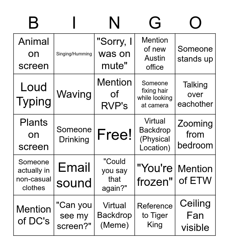This bingo card has a free space and 30 words: "Can you see my screen?", Someone Eating, Someone Drinking, Child on screen, Animal on screen, "Sorry, I was on mute", Waving, "Could you say that again?", Virtual Backdrop (Physical Location), Virtual Backdrop (Meme), Zooming from bedroom, Ceiling Fan visible, Reference to Tiger King, "Touch Base", Talking over eachother, "Sorry, you first", "You're frozen", Someone actually in non-casual clothes, Email sound, Someone stands up, Plants on screen, Photos on screen, Singing/Humming, Someone fixing hair while looking at camera, Loud Typing, Mention of new Austin office, Mention of ETW, Mention of DC's, Mention of RVP's and Mention of Doug or Larry.