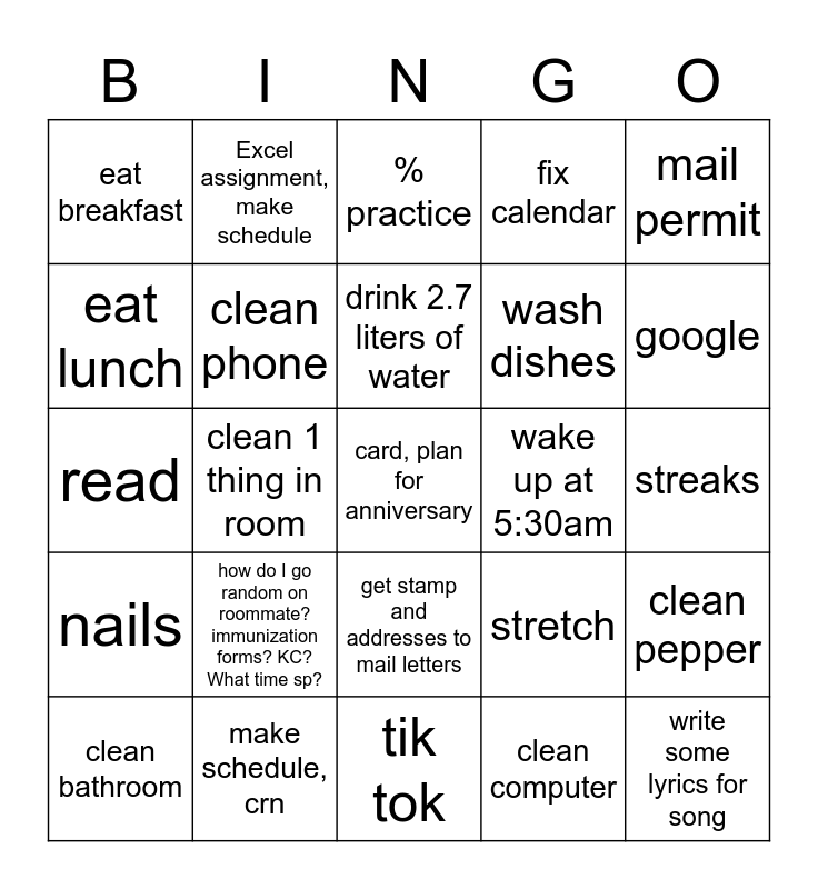 This bingo card has a free space and 24 words: how do I go random on roommate? immunization forms? KC? What time sp?, make schedule, crn, drink 2.7 liters of water, clean bathroom, mail permit, eat breakfast, eat lunch, Excel assignment, make schedule, wake up at 5:30am, get stamp and addresses to mail letters, wash dishes, read, stretch, clean pepper, clean phone, clean computer, streaks, % practice, google, clean 1 thing in room, write some lyrics for song, nails, fix calendar and tik tok.
