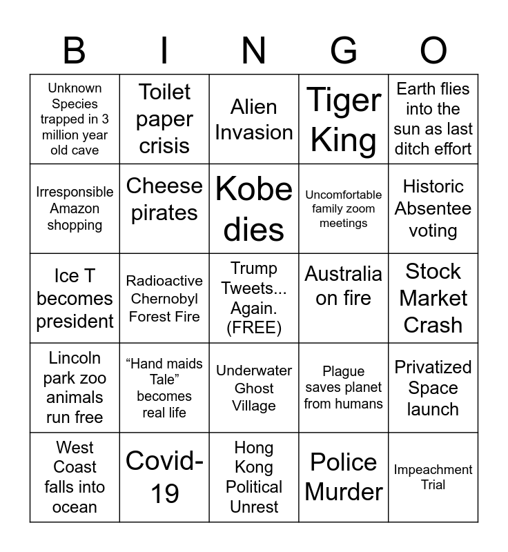 This bingo card has a free space and 30 words: Covid-19, Rioting and Looting, Radioactive Chernobyl Forest Fire, Murder Hornets, Unknown Species trapped in 3 million year old cave, Alien Invasion, Cheese pirates, Underwater Ghost Village, Australia on fire, Hong Kong Political Unrest, Stock Market Crash, Impeachment Trial, Police Murder, Canadian Army saves old people, Historic Absentee voting, Sprained Dog tails, Plague saves planet from humans, Lincoln park zoo animals run free, “Hand maids Tale” becomes real life, Earth flies into the sun as last ditch effort, Ice T becomes president, Dolphins reinhabit Italian coast, Toilet paper crisis, Uncomfortable family zoom meetings, Irresponsible Amazon shopping, Tiger King, Privatized Space launch, West Coast falls into ocean, Kobe dies and Olympics postponed.