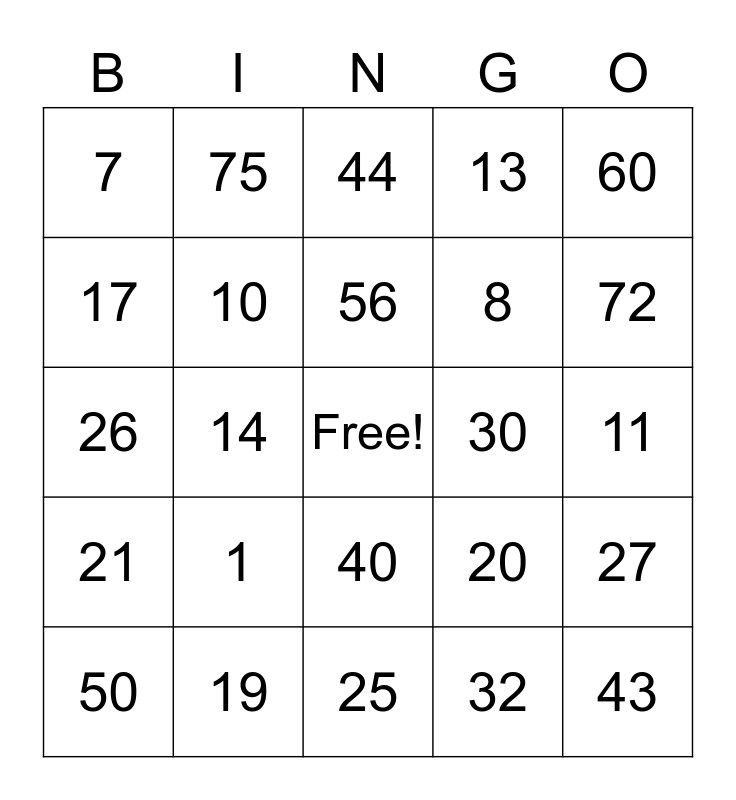 This bingo card has a free space and 24 words: 1, 19, 56, 50, 60, 7, 17, 75, 30, 40, 8, 26, 20, 27, 10, 32, 11, 44, 72, 14, 43, 21, 13 and 25.