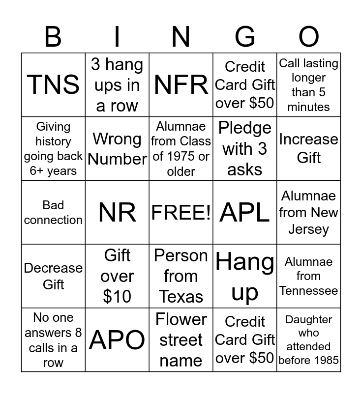 This bingo card has a free space and 24 words: Gift over $10, APO, Alumnae from Class of 1975 or older, No one answers 8 calls in a row, Call lasting longer than 5 minutes, TNS, Giving history going back 6+ years, 3 hang ups in a row, APL, Person from Texas, Pledge with 3 asks, Bad connection, Hang up, Alumnae from Tennessee, Wrong Number, Credit Card Gift over $50, Alumnae from New Jersey, NFR, Increase Gift, NR, Daughter who attended before 1985, Decrease Gift, Credit Card Gift over $50 and Flower street name.