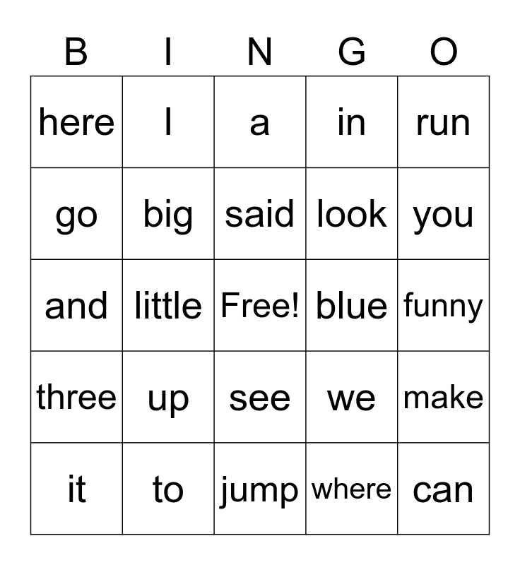This bingo card has a free space and 24 words: up, to, said, it, run, here, go, I, blue, see, look, and, we, make, big, where, funny, a, you, little, can, three, in and jump.