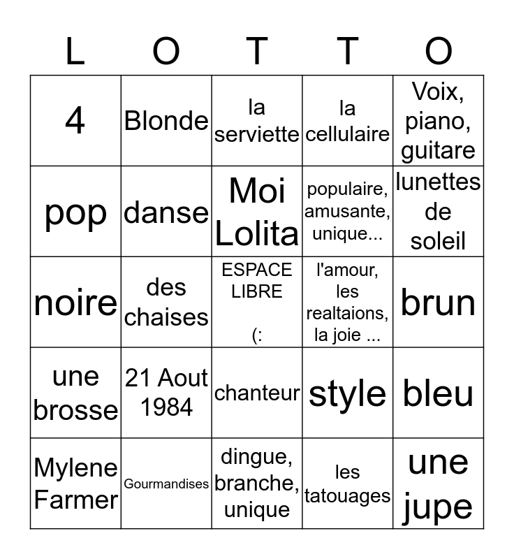 This bingo card has a free space and 24 words: 21 Aout 1984, Gourmandises, Moi Lolita, Mylene Farmer, Voix, piano, guitare, 4, pop, Blonde, l'amour, les realtaions, la joie ..., chanteur, populaire, amusante, unique..., noire, style, bleu, danse, les tatouages, brun, la serviette, lunettes de soleil, des chaises, une jupe, une brosse, la cellulaire and dingue, branche, unique.