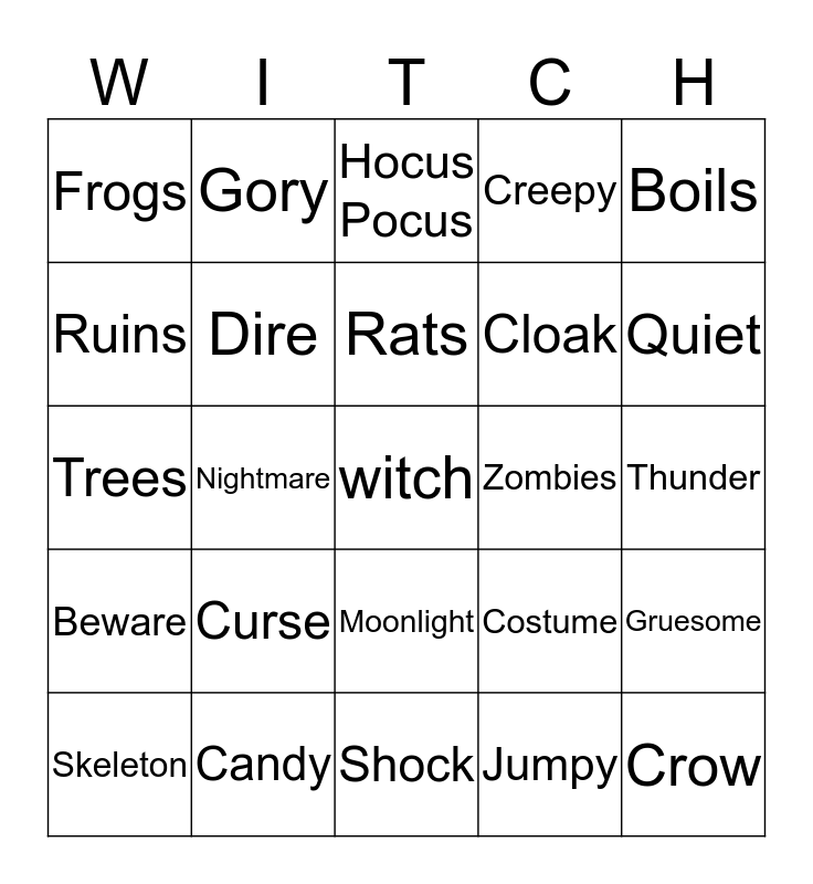 This bingo card has a free space and 120 words: Broomstick, Bump in the night, Cackle, Cobwebs, Coffin, Creaking, Creepy, Dead, Gruesome, Haunted, Haunted House, Heavy breathing, Insane, Lightning, Mischievous, Monster, Moonlight, Noises, Quaking, RIP, Skeleton, Hocus Pocus, Horrible, Howling, Apple Bobbing, Beware, Candy, Hair Raising, Hidden, Horror, Jumpy, Nightmare, Rats, Raven, Scratching, Secluded, Shadows, Skulls, Souls, Tomb Stone, Torch light, Trapped, Twisted, Whispers, Wicked, Wolves, Woods, Zombies, Axe, Chilling, Cold, Corpse, Costume, Damp, Evil, Eyeballs, Fangs, Fear, Ghost, Gory, Grave, Haunted House, Hiding, Midnight, Rotting, Ruins, Scary, Shrieking, Spells, Spiders, Trees, Undead, Bats, Black cat, Blood, Cat, Cloak, Clock, Crow, Curse, Frogs, Full moon, Games, Mist, Moans & groans, Mummies, Shock, Strange, Supernatural, Tapping, Terror, Thunder, Toads, Torment, Unnerving, Werewolves, Blood Curdling, Boils, Bone Rattling, Boo, Brewing, Casper, Crossbones, Devil, Devilish, Dire, Graveyard, Grim Reaper, Invisible, Isolated, Jack O Lantern, Lurking, Panic, Paranormal, Quiet, Quiver, Tense, Threatening, Thrill and Tip toe.