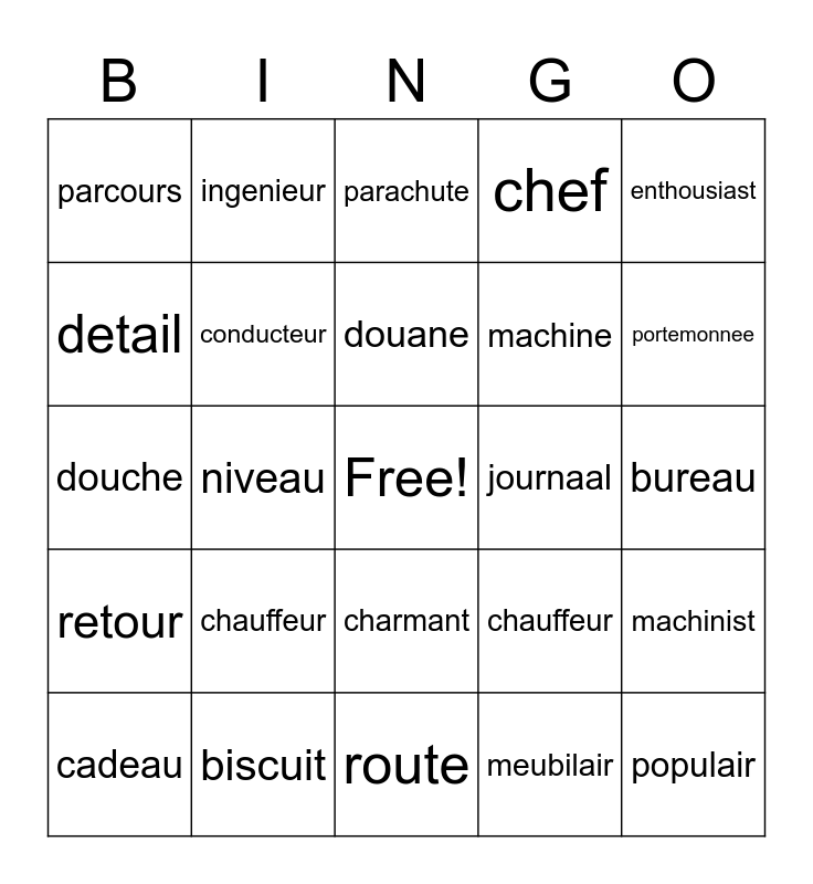 This bingo card has a free space and 24 words: chauffeur, biscuit, douane, cadeau, enthousiast, parcours, detail, ingenieur, journaal, charmant, machine, douche, chauffeur, machinist, conducteur, meubilair, bureau, parachute, portemonnee, niveau, populair, retour, chef and route.