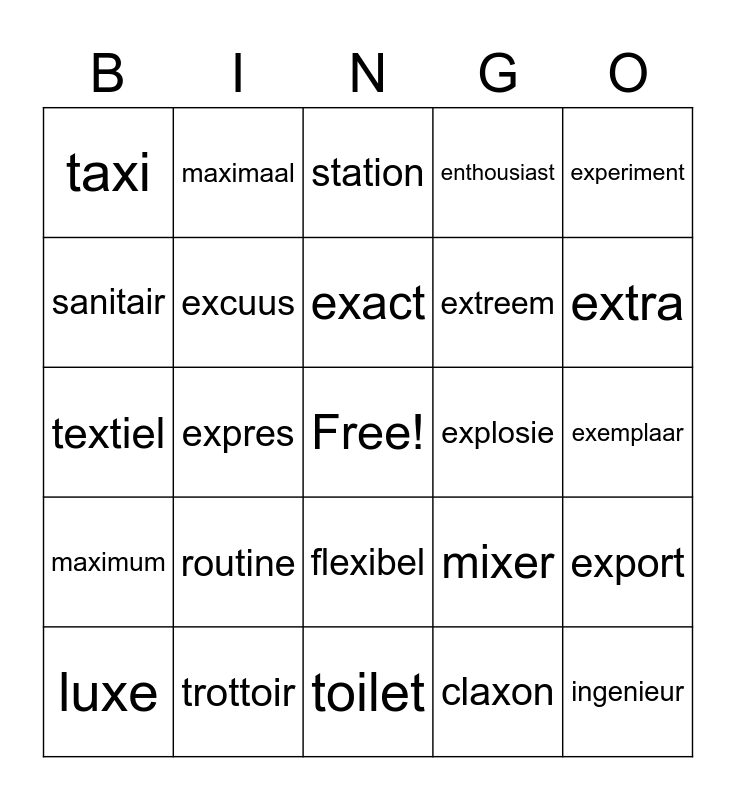 This bingo card has a free space and 24 words: routine, trottoir, exact, luxe, experiment, taxi, sanitair, maximaal, explosie, flexibel, extreem, textiel, mixer, export, excuus, claxon, exemplaar, station, extra, expres, ingenieur, maximum, enthousiast and toilet.