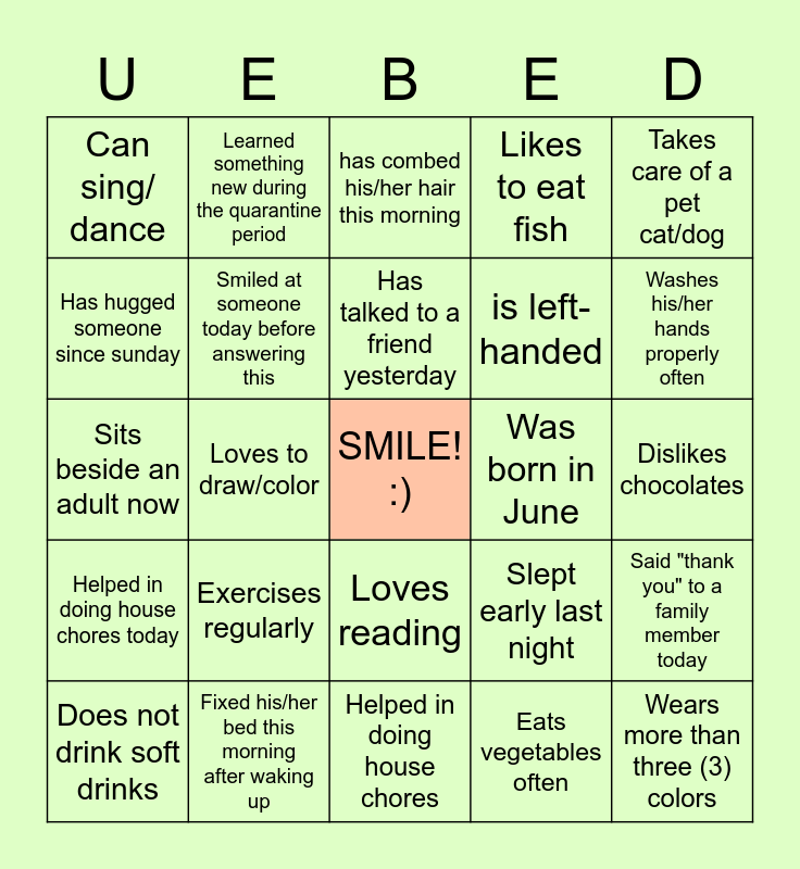 This bingo card has a free space and 24 words: Exercises regularly, Fixed his/her bed this morning after waking up, Has talked to a friend yesterday, Does not drink soft drinks, Takes care of a pet cat/dog, Can sing/ dance, Has hugged someone since sunday, Learned something new during the quarantine period, Was born in June, Loves reading, is left-handed, Sits beside an adult now, Slept early last night, Said "thank you" to a family member today, Smiled at someone today before answering this, Eats vegetables often, Dislikes chocolates, has combed his/her hair this morning, Washes his/her hands properly often, Loves to draw/color, Wears more than three (3) colors, Helped in doing house chores today, Likes to eat fish and Helped in doing house chores.