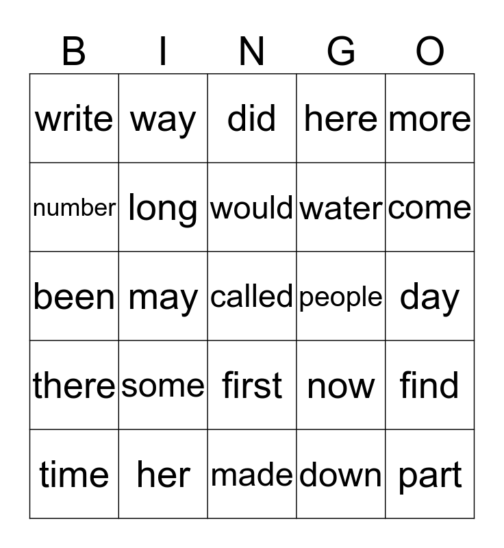 This bingo card has a free space and 24 words: some, her, would, time, more, write, number, way, people, first, water, been, now, find, long, down, day, did, come, may, part, there, here and made.