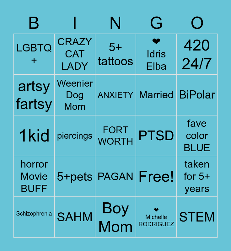 This bingo card has 25 words: 5+pets, Boy Mom, ANXIETY, Schizophrenia, 420 24/7, LGBTQ +, artsy fartsy, CRAZY CAT LADY, PTSD, PAGAN, Married, 1kid, Free!, taken for 5+ years, Weenier Dog Mom, STEM, fave color BLUE, 5+ tattoos, BiPolar, piercings, FORT WORTH, SAHM, horror Movie BUFF, ❤ Idris Elba and ❤ Michelle RODRIGUEZ.
