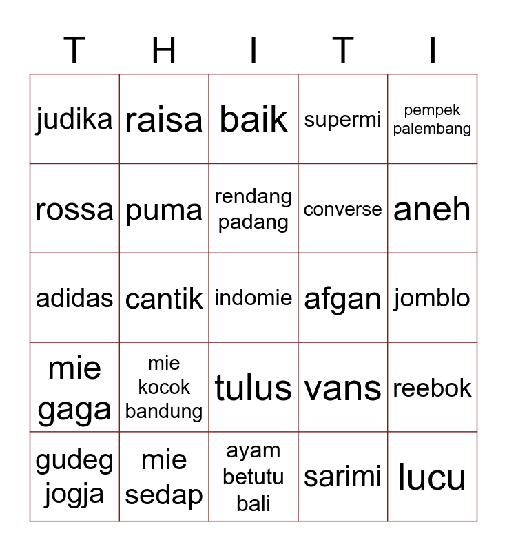 This bingo card has 25 words: mie kocok bandung, ayam betutu bali, rendang padang, gudeg jogja, pempek palembang, judika, rossa, raisa, afgan, tulus, converse, adidas, vans, reebok, puma, lucu, jomblo, baik, aneh, cantik, indomie, mie sedap, mie gaga, supermi and sarimi.