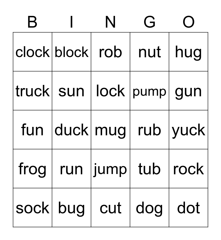 This bingo card has a free space and 24 words: run, bug, lock, sock, hug, clock, truck, block, rub, jump, pump, fun, tub, rock, sun, dog, yuck, rob, gun, duck, dot, frog, nut and cut.