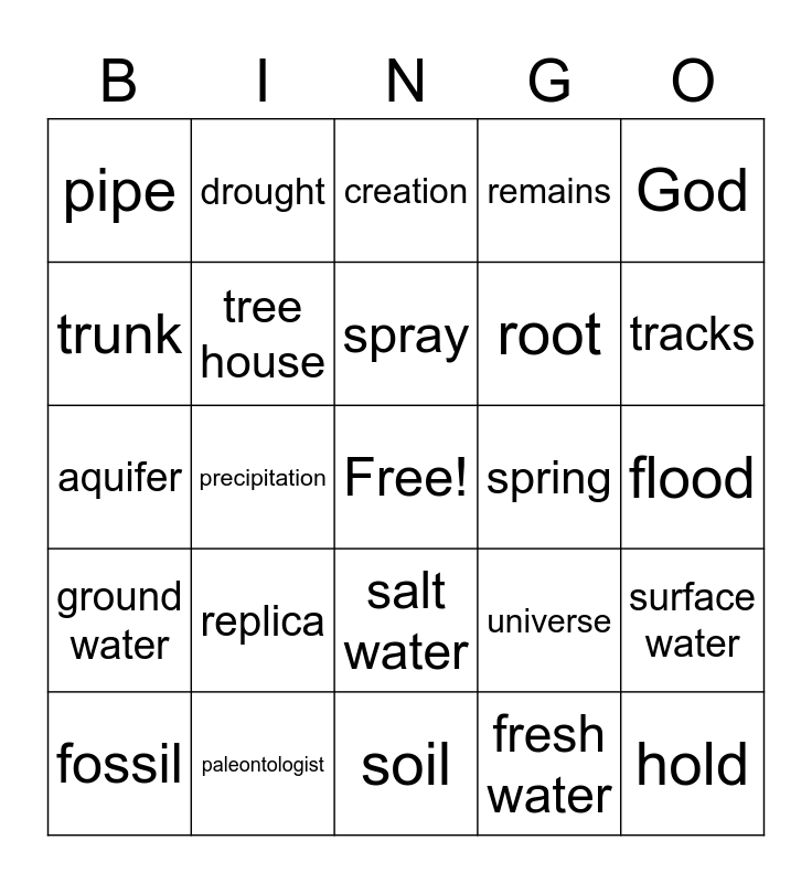 This bingo card has a free space and 34 words: bank, branch, bridge, current, flood, trunk, tree house, soil, root, hold, aquifer, drought, fresh water, glacier, ground water, precipitation, salt water, spring, surface water, fossil, paleontologist, sediment, remains, tracks, discovery, replica, creation, creature, God, pipe, smoke, spray, universe and world.