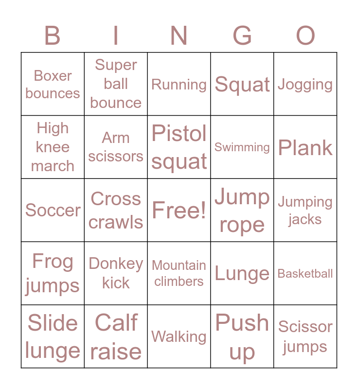 This bingo card has a free space and 24 words: Donkey kick, Calf raise, Pistol squat, Slide lunge, Jogging, Boxer bounces, High knee march, Super ball bounce, Jump rope, Mountain climbers, Swimming, Soccer, Lunge, Basketball, Arm scissors, Push up, Jumping jacks, Running, Plank, Cross crawls, Scissor jumps, Frog jumps, Squat and Walking.