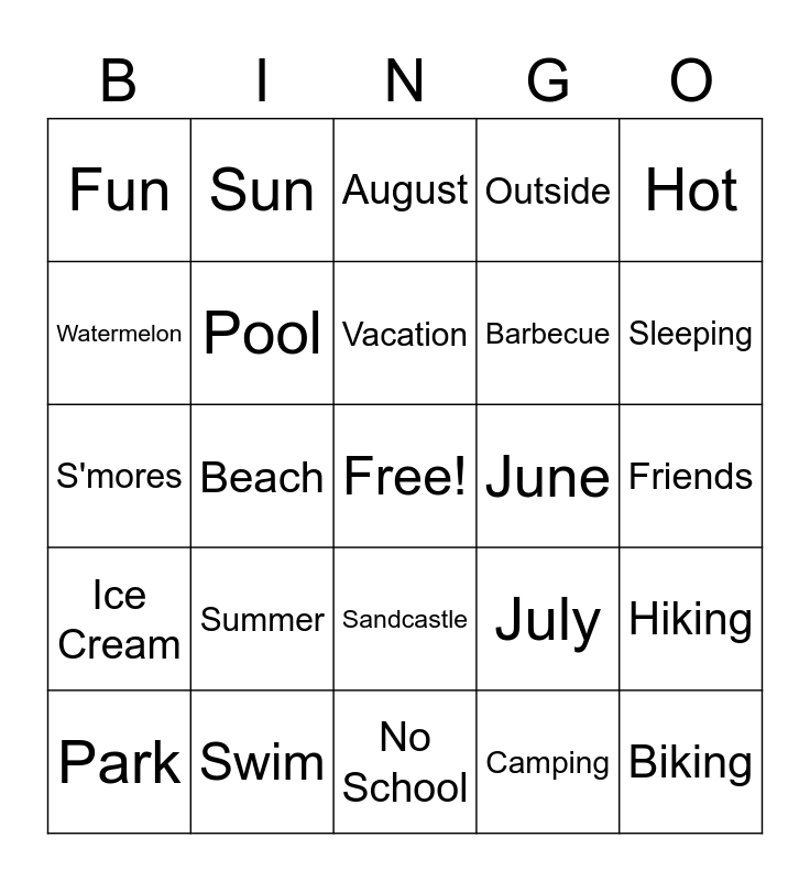 This bingo card has a free space and 24 words: Summer, Swim, Vacation, Park, Hot, Fun, Watermelon, Sun, June, Sandcastle, Barbecue, S'mores, July, Hiking, Pool, Camping, Friends, August, Sleeping, Beach, Biking, Ice Cream, Outside and No School.