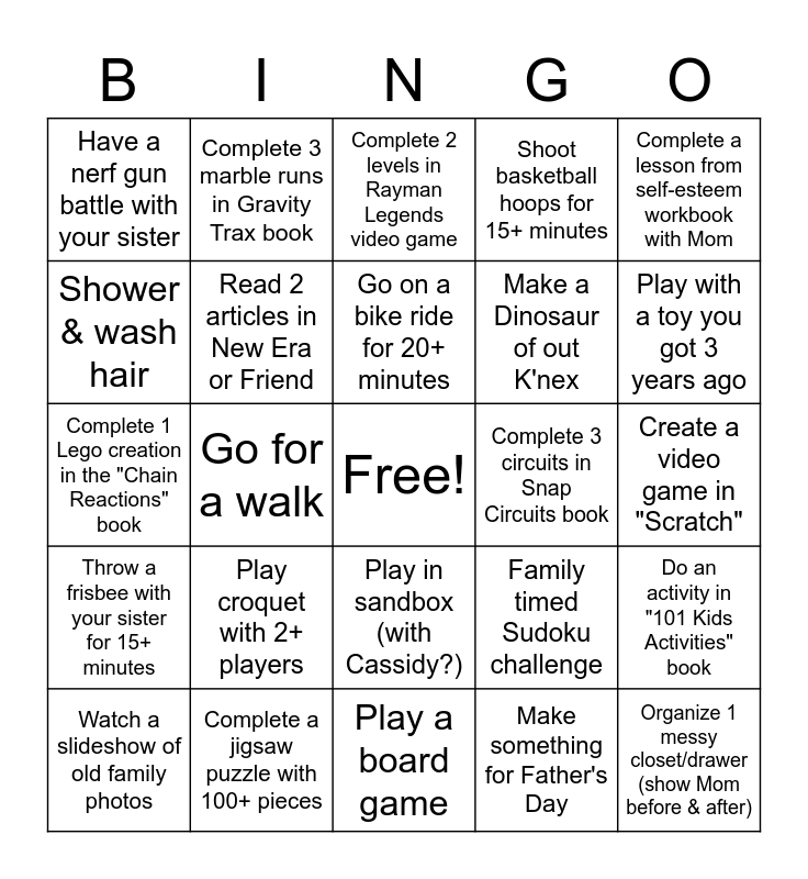 This bingo card has a free space and 24 words: Play croquet with 2+ players, Complete a jigsaw puzzle with 100+ pieces, Go on a bike ride for 20+ minutes, Watch a slideshow of old family photos, Complete a lesson from self-esteem workbook with Mom, Have a nerf gun battle with your sister, Shower & wash hair, Complete 3 marble runs in Gravity Trax book, Complete 3 circuits in Snap Circuits book, Play in sandbox (with Cassidy?), Make a Dinosaur of out K'nex, Complete 1 Lego creation in the "Chain Reactions" book, Family timed Sudoku challenge, Do an activity in "101 Kids Activities" book, Read 2 articles in New Era or Friend, Make something for Father's Day, Create a video game in "Scratch", Complete 2 levels in Rayman Legends video game, Play with a toy you got 3 years ago, Go for a walk, Organize 1 messy closet/drawer (show Mom before & after), Throw a frisbee with your sister for 15+ minutes, Shoot basketball hoops for 15+ minutes and Play a board game.