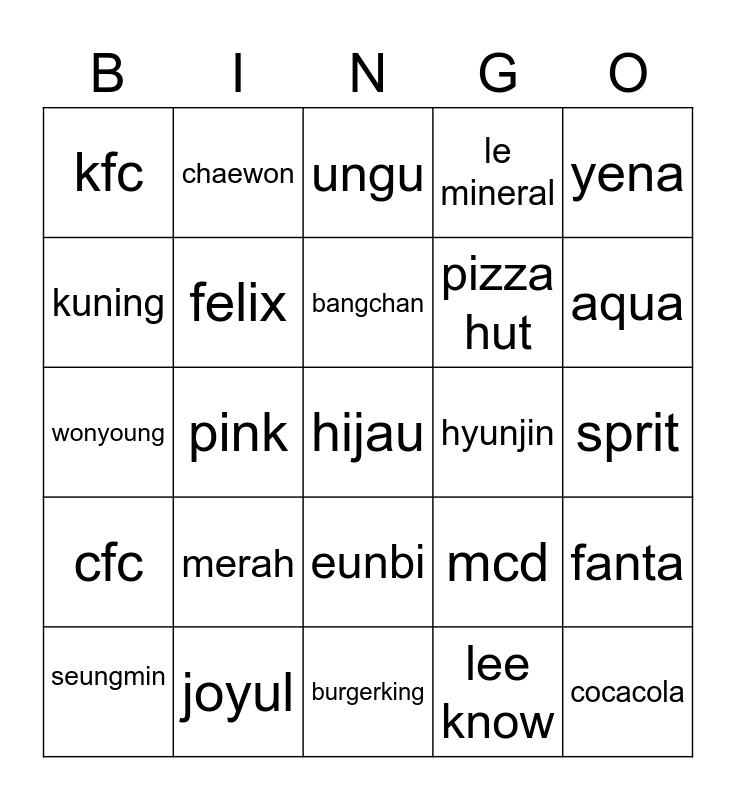 This bingo card has a free space and 24 words: merah, joyul, bangchan, seungmin, yena, kfc, kuning, chaewon, hyunjin, eunbi, pizza hut, wonyoung, mcd, fanta, felix, lee know, sprit, ungu, aqua, pink, cocacola, cfc, le mineral and burgerking.