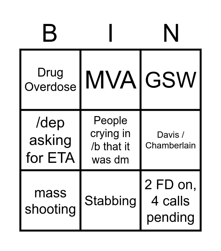 This bingo card has a free space and 8 words: Davis / Chamberlain, GSW, MVA, mass shooting, Drug Overdose, 2 FD on, 4 calls pending, /dep asking for ETA and Stabbing.