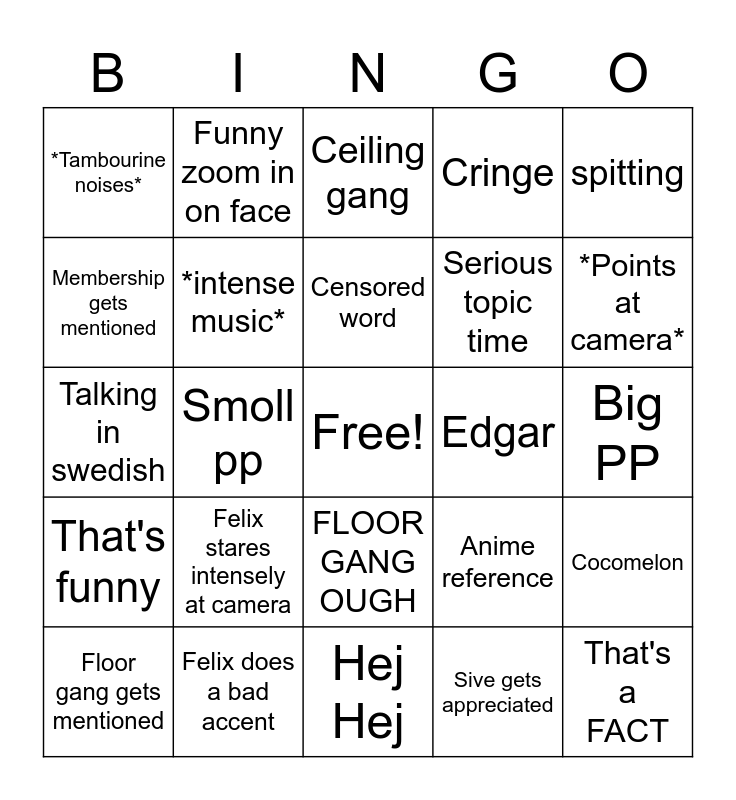 This bingo card has a free space and 24 words: Felix stares intensely at camera, Felix does a bad accent, Censored word, Floor gang gets mentioned, spitting, *Tambourine noises*, Membership gets mentioned, Funny zoom in on face, Edgar, FLOOR GANG OUGH, Serious topic time, Talking in swedish, Anime reference, Cocomelon, *intense music*, Sive gets appreciated, Big PP, Ceiling gang, *Points at camera*, Smoll pp, That's a FACT, That's funny, Cringe and Hej Hej.