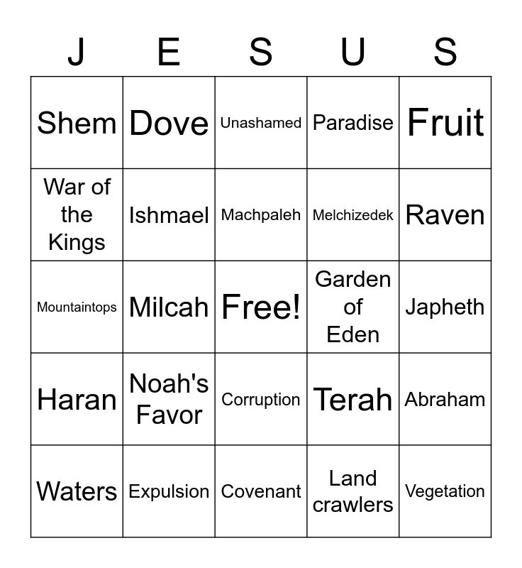 This bingo card has a free space and 43 words: Genesis, Vegetation, Earth, Waters, Livestock, Land crawlers, Unashamed, Serpent's Deception, Fruit, Expulsion, Paradise, Garden of Eden, Corruption, Noah's Favor, Ark Preparation, Covenant, The Great Flood, Mountaintops, Ararat, Raven, Dove, Canaan's Curse, Noah, Shem, Ham, Japheth, Table of Nations, Tower of Babel, Terah, Haran, Lot, Abraham, Sarah, Milcah, Nahor, Negev, Promise Renewal, Machpaleh, War of the Kings, Melchizedek, Hagar, Ishmael and Father of Many Nations.