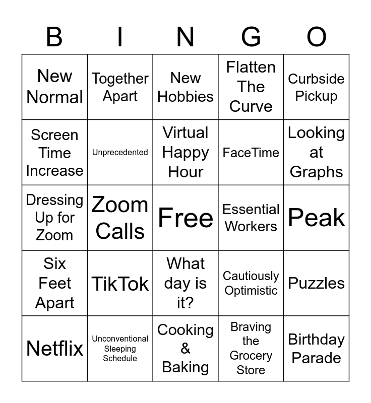 This bingo card has a free space and 39 words: Tiger King, Online Workouts, Stimulus Check, Unprecedented, Netflix, What day is it?, Virtual Happy Hour, Working in Pajamas, Curbside Pickup, Six Feet Apart, Zoom Calls, Flatten The Curve, Birthday Parade, Peak, Essential Workers, TikTok, Online Shopping, New Normal, Livestream, Cautiously Optimistic, Screen Time Increase, Cooking & Baking, FaceTime, Looking at Graphs, Celebrity Fundraising, Daily Briefings, Stay At Home Order, At-Home Hair Disasters, COVID Task Force, Together Apart, Homemade Face Masks, EIDL Loans, New Hobbies, Unconventional Sleeping Schedule, Braving the Grocery Store, Spring Cleaning, Puzzles, Dressing Up for Zoom and Hope This Email Finds You Well.