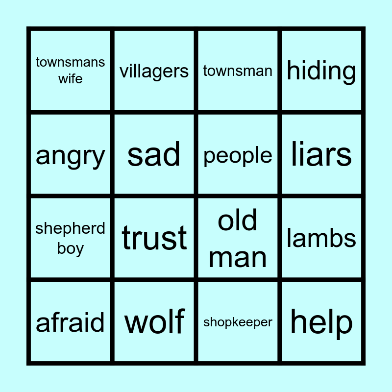 This bingo card has 16 words: wolf, lambs, townsman, townsmans wife, shepherd boy, villagers, old man, shopkeeper, angry, sad, afraid, hiding, trust, liars, people and help.