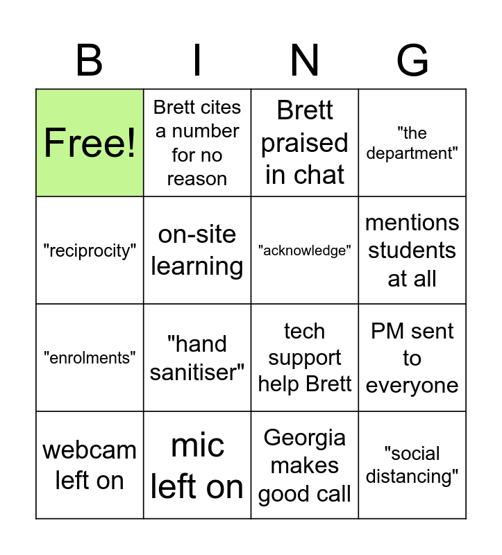 This bingo card has 16 words: webcam left on, mic left on, Brett praised in chat, "the department", "reciprocity", Brett cites a number for no reason, tech support help Brett, PM sent to everyone, Free!, on-site learning, Georgia makes good call, mentions students at all, "enrolments", "hand sanitiser", "acknowledge" and "social distancing".