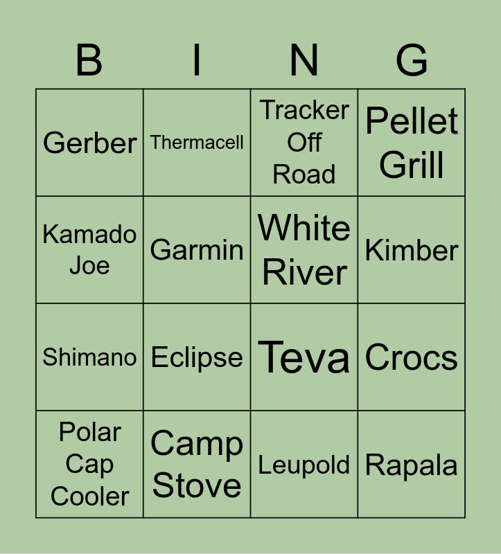 This bingo card has 16 words: Polar Cap Cooler, Camp Stove, Tracker Off Road, Pellet Grill, Kamado Joe, Thermacell, Teva, Crocs, Gerber, Garmin, Leupold, Kimber, Shimano, Eclipse, White River and Rapala.