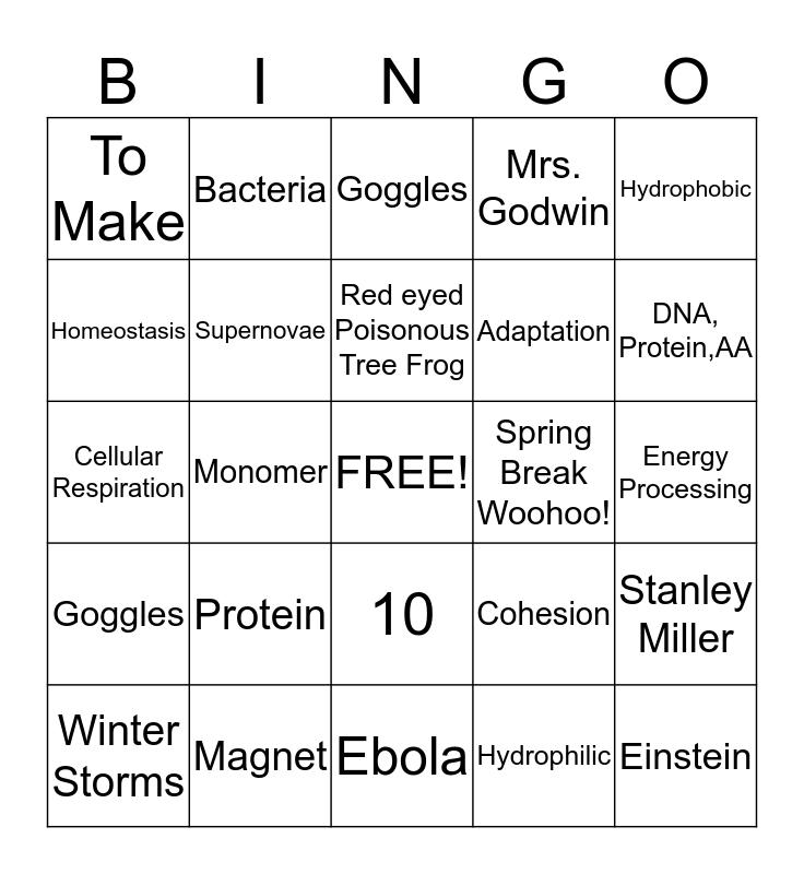 This bingo card has a free space and 24 words: Protein, Magnet, Red eyed Poisonous Tree Frog, Winter Storms, Hydrophobic, To Make, Homeostasis, Bacteria, Spring Break Woohoo!, 10, Adaptation, Cellular Respiration, Cohesion, Stanley Miller, Supernovae, Hydrophilic, Energy Processing, Goggles, DNA, Protein,AA, Monomer, Einstein, Goggles, Mrs. Godwin and Ebola.