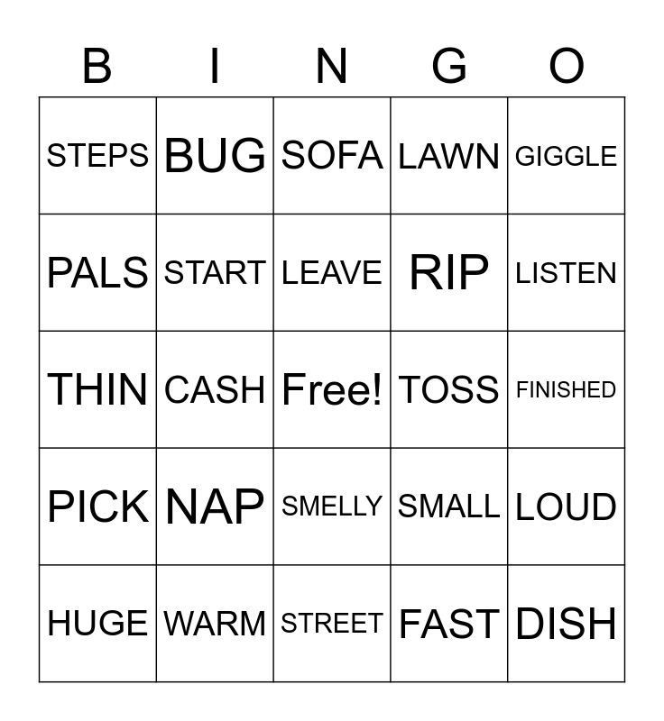 This bingo card has a free space and 24 words: NAP, WARM, LEAVE, HUGE, GIGGLE, STEPS, PALS, BUG, TOSS, SMELLY, RIP, THIN, SMALL, LOUD, START, FAST, FINISHED, SOFA, LISTEN, CASH, DISH, PICK, LAWN and STREET.