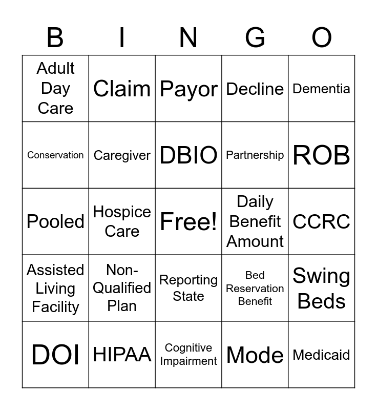 This bingo card has a free space and 73 words: Activities of Daily Living, ADL, Adult Day Care, Alzheimer’s disease, Amendment, Alternate Plan of Care, Assisted Living Facility, AWD, Bed Reservation Benefit, Benefit Period, BIO, Care Coordination Benefit, Caregiver, CCRC, Chronically ill, Claim, Cognitive Impairment, Conservation, Custodial Care, Daily Benefit Amount, DBIO, Decline, Dementia, DMS, DOI, Effective Date, Elimination Period, Endorsement, GPO, Grace Period, HIPAA, Home Care, Home Health Care, Home Health Care Agency, Hospice Care, Indemnity, Lapse, Long Term Care Insurance, Medicaid, Method, Mode, Non-Qualified Plan, Nonforfeiture Benefits, PAC, Paid to Date, Partnership, Payor, POA, POL – Proof of Loss, Pooled, Power of Attorney: Durable, Power of Attorney: Non-Durable, Power of Attorney: Health, Power of Attorney: General, Premium, Reinstatement, Rescission, Reporting State, Resident State, Respite Care, Restoration of Benefits, Return of Premium, Rider, ROB, Servicing Agent, Skilled Care, SLA, Survivorship, Swing Beds, Tax Qualified, TPN, Underwriting and Waiver of Premiums.