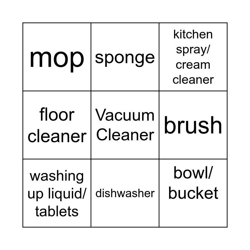 This bingo card has 9 words: washing up liquid/ tablets, kitchen spray/ cream cleaner, sponge, floor cleaner, mop, brush, Vacuum Cleaner, bowl/ bucket and dishwasher.