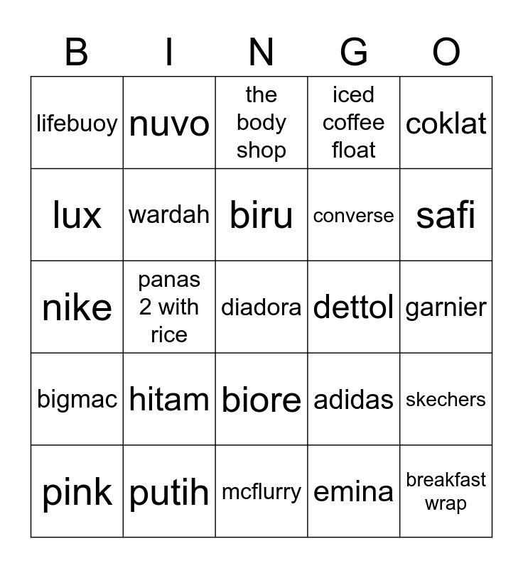 This bingo card has a free space and 24 words: hitam, putih, biru, pink, coklat, lifebuoy, lux, nuvo, dettol, biore, converse, nike, adidas, skechers, wardah, emina, garnier, the body shop, safi, panas 2 with rice, breakfast wrap, bigmac, iced coffee float and mcflurry.
