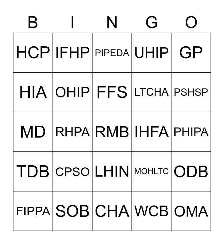 This bingo card has 25 words: CPSO, CHA, FFS, FIPPA, GP, HCP, HIA, IFHP, IHFA, LHIN, LTCHA, MD, MOHLTC, ODB, OHIP, OMA, PHIPA, PIPEDA, PSHSP, RHPA, RMB, SOB, TDB, UHIP and WCB.
