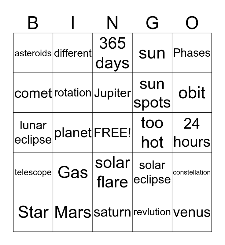 This bingo card has a free space and 24 words: Gas, Mars, Jupiter, Star, Phases, asteroids, comet, different, too hot, solar flare, sun spots, lunar eclipse, solar eclipse, constellation, rotation, revlution, 24 hours, 365 days, obit, planet, venus, telescope, sun and saturn.