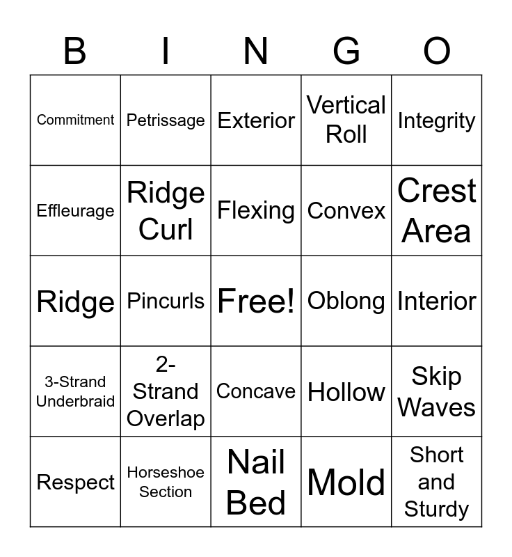 This bingo card has a free space and 24 words: 2-Strand Overlap, Horseshoe Section, Flexing, Respect, Integrity, Commitment, Effleurage, Petrissage, Oblong, Concave, Convex, Ridge, Hollow, Skip Waves, Ridge Curl, Mold, Interior, Exterior, Crest Area, Pincurls, Short and Sturdy, 3-Strand Underbraid, Vertical Roll and Nail Bed.