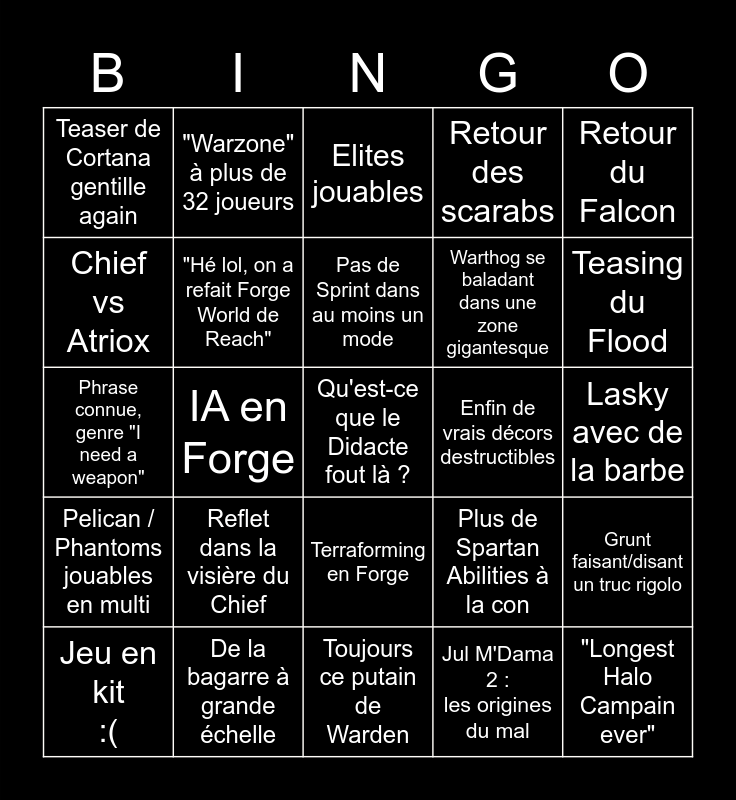 This bingo card has 25 words: Reflet dans la visière du Chief, Toujours ce putain de Warden, Pas de Sprint dans au moins un mode, Jeu en kit :(, Retour du Falcon, Teaser de Cortana gentille again, Chief vs Atriox, "Warzone" à plus de 32 joueurs, Enfin de vrais décors destructibles, Terraforming en Forge, Warthog se baladant dans une zone gigantesque, Phrase connue, genre "I need a weapon", Plus de Spartan Abilities à la con, Grunt faisant/disant un truc rigolo, "Hé lol, on a refait Forge World de Reach", "Longest Halo Campain ever", Lasky avec de la barbe, Elites jouables, Teasing du Flood, IA en Forge, Qu'est-ce que le Didacte fout là ?, De la bagarre à grande échelle, Pelican / Phantoms jouables en multi, Retour des scarabs and Jul M'Dama 2 : les origines du mal.