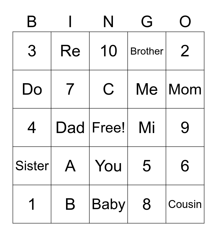 This bingo card has a free space and 24 words: A, B, C, 1, 2, 3, Do, Re, Mi, You, Me, 4, 5, 6, 7, 8, 9, 10, Mom, Dad, Cousin, Sister, Brother and Baby.