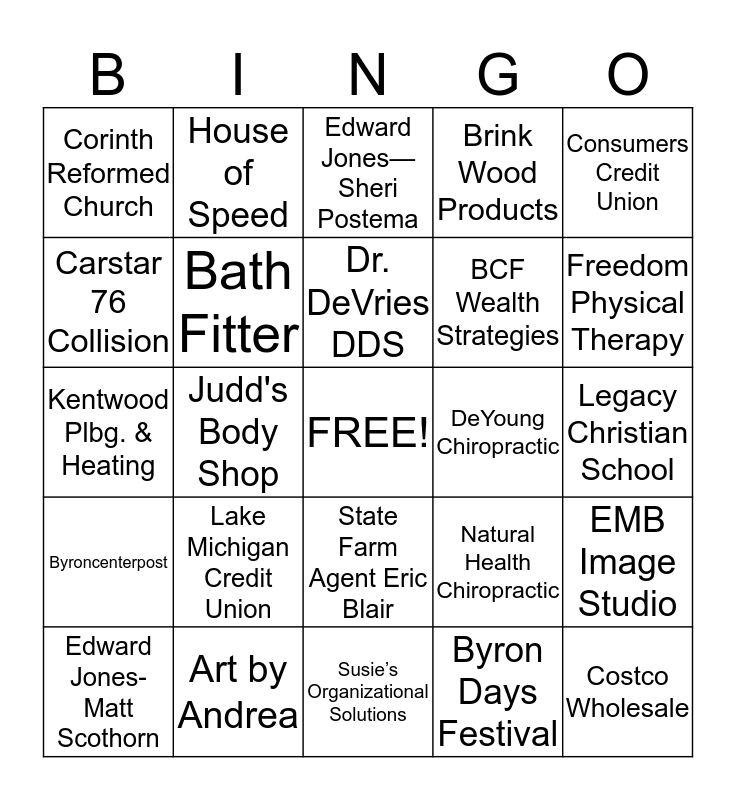 This bingo card has a free space and 61 words: AP Tutors, Art by Andrea, ASEA & RENU 28, Byroncenterpost, Byron Days Festival, BCFAB, Bath Fitter, Byron Center Animal Hospital, BCF Wealth Strategies, Better Life Church, Brink Wood Products, Byron Community Ministries, Carstar 76 Collision, Chemical Bank, Cook Funeral & Cremation Services, Corinth Reformed Church, Costco Wholesale, Consumers Credit Union, Davenport University, Dr. DeVries DDS, DeYoung Chiropractic, Edward Jones—Sheri Postema, Edward Jones-Matt Scothorn, EMB Image Studio, Eric Lee Photos, Faith Hospice Holland Home, Family Fare, Farm Bureau Insurance (Huisman,Quakkelaar), Freedom Physical Therapy, Gordon Water Systems, Great Clips (marketplace), Harrison Chiropractic, Hilltop Auto, Higher Health Chiropractic, House of Speed, IPV Consulting, It Works Global, Judd's Body Shop, Kent District Library, Kentwood Plbg. & Heating, Keystone Retirement Services, Lake Michigan Credit Union, Legacy Christian School, LIFE Driver Training, Natural Health Chiropractic, New York Life—Gerald Sullivan, Railside Assisted Living Center, Rebath of GR, Snap Fitness, State Farm Agent Eric Blair, Susie’s Organizational Solutions, Themo King of Michigan, The Center for Physical Rehabilitation, The Fun Spot, Thrive Chiropractic, United Bank, U. S. Army, Vanderlaan Family Dentistry, Walters Equipment, Walgreens and Young Living Essential Oils.